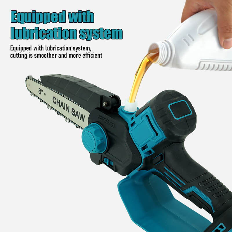 The built-in oiling system lubricates the chain automatically, ensuring smooth performance and less wear. As a mini chainsaw battery powered design, it is lightweight yet strong, making it an ideal rechargeable chainsaw for everyday tasks.