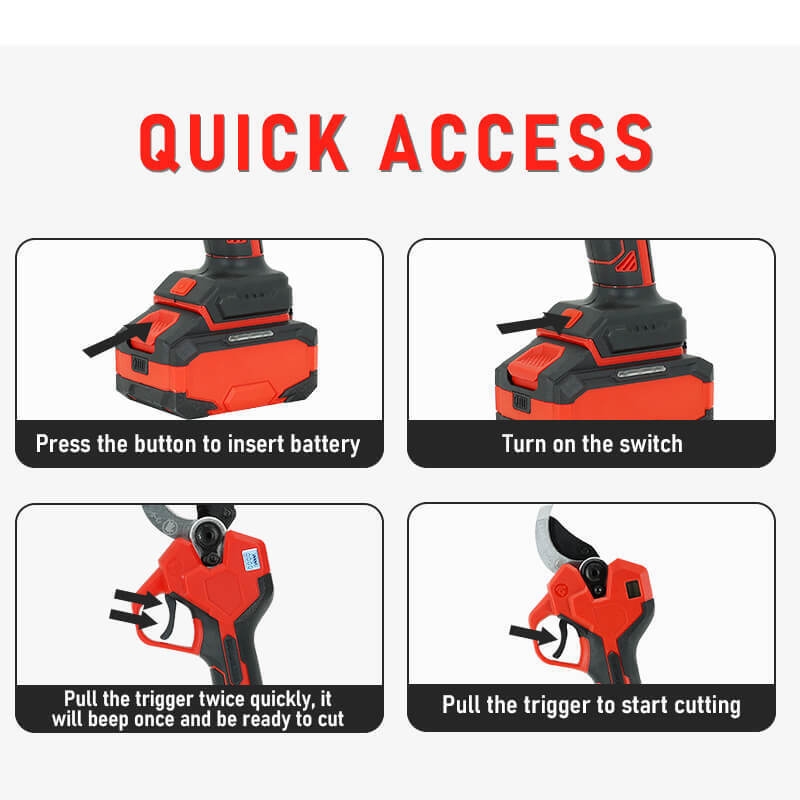 Essendo una forbice da potatura ricaricabile e alimentata a batteria, offre un lungo tempo di lavoro e un'ottima portabilità.La struttura leggera e il design senza fili rendono queste forbici elettriche una soluzione di potatura efficiente e facile da usare.